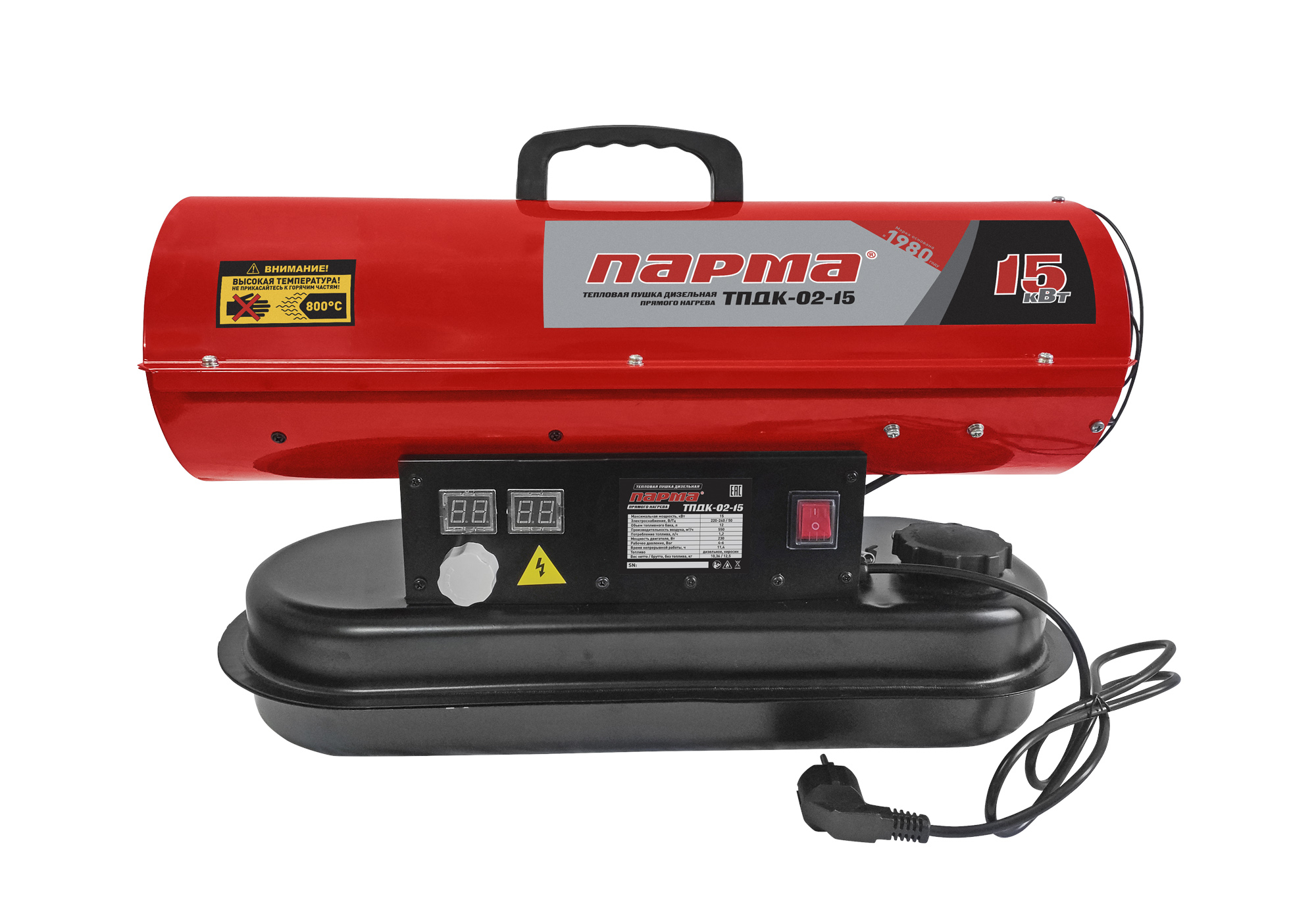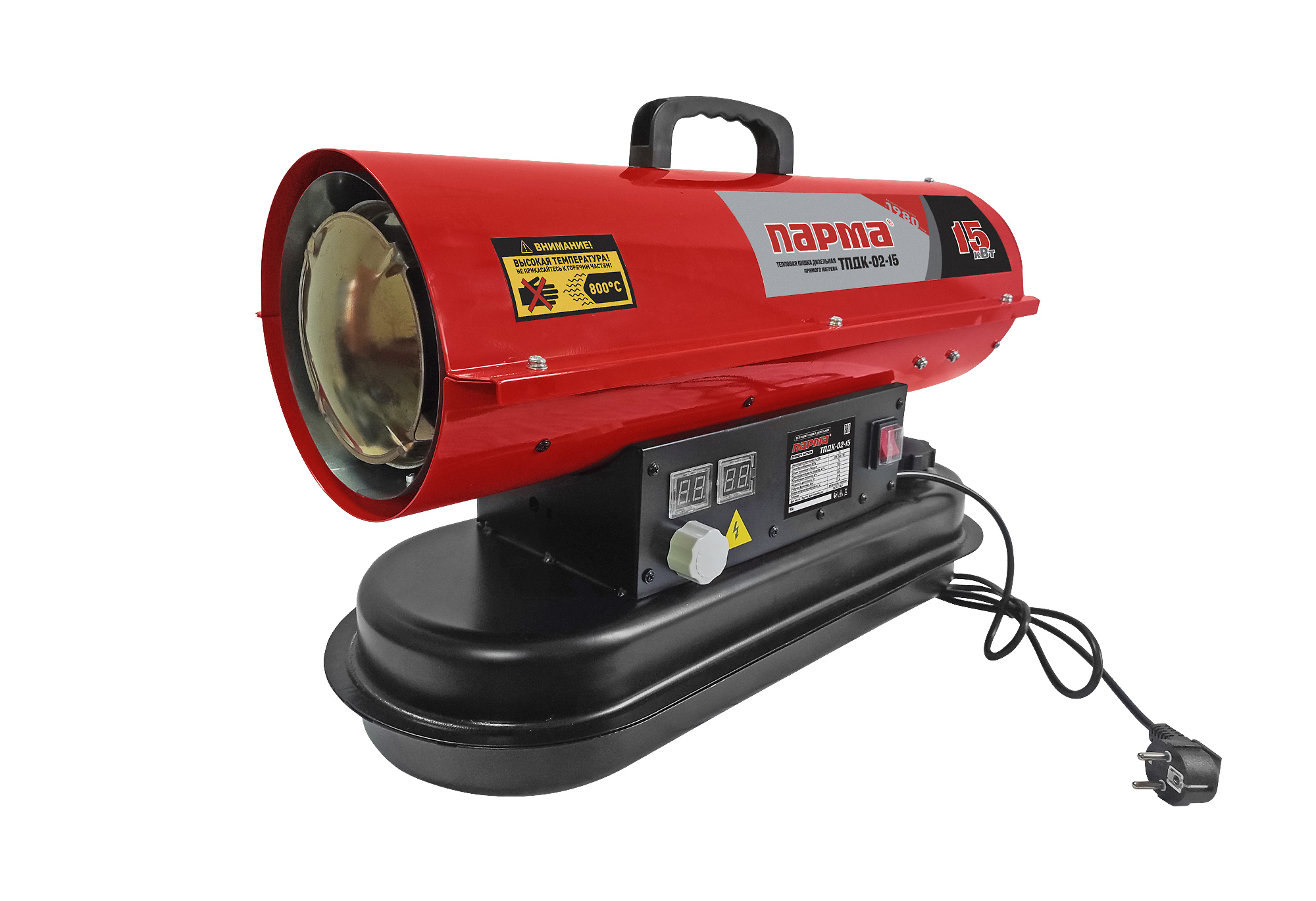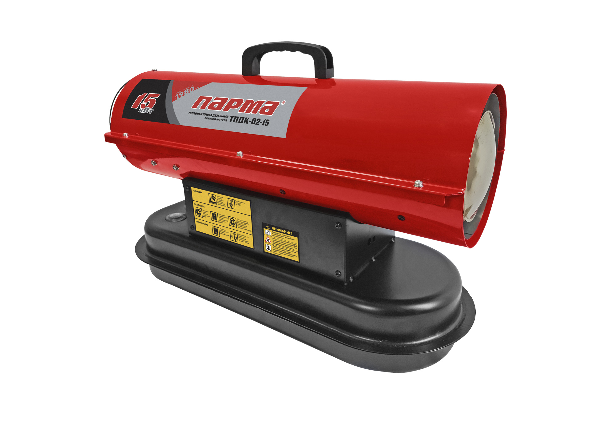 Дизельная тепловая пушка Парма ТПДК-15ПК – это переносная тепловая пушка прямого горения, предназначенная для безопасного, надежного и эффективного обогрева помещений в условиях умеренного климата категории размещения 3.1 (УХЛ 3.1) по ГОСТ 15150-69.